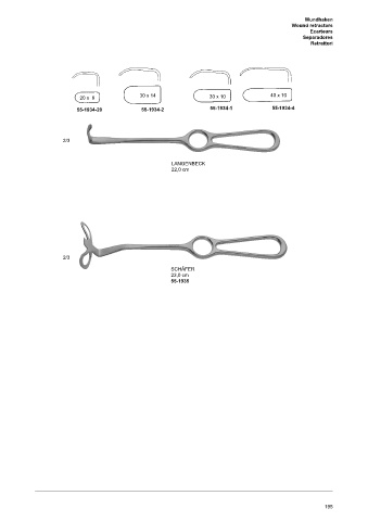 Wundhaken Wound retractors Ecarteurs Separadores Retrattori 20 x 8 30 x 14 30 x 10 40 x 10 55-1934-20 55-1934-2 55-1934-1 55-1934-4 2/3 LANGENBECK 22,0 cm 2/3 SCHäFER 23,0 cm 55-1935 195